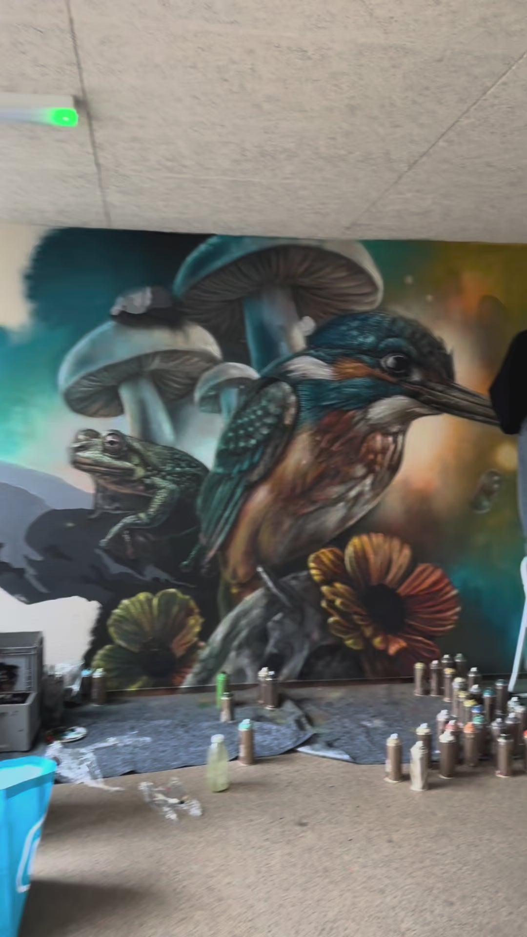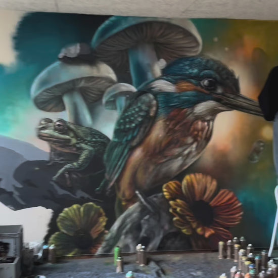 Het originele kunstwerk van IJsvogel werd door RoosArt gecreëerd met spuitbussen en acrylverf — een combinatie die zorgt voor intense kleuren, zachte overgangen en een rijk gevoel van diepte. Het werk is direct herkenbaar aan de realistische stijl, gecombineerd met kleurgebruik dat typisch is voor RoosArt.